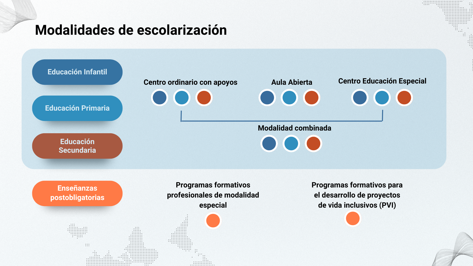 • Escolarización en Programas formativos para el desarrollo de proyectos de vida inclusivos (PVI): destinados a aquellos alumnos que tengan cumplidos los dieciséis años o los cumplan en el año natural en que los inician, y hayan cursado la enseñanza básica en unidades o centros de educación especial.