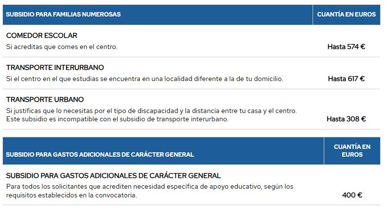 Importante: No se conceden las ayudas o subsidios (excepto el subsidio para gastos adicionales de carácter general, que se concederá siempre que se justifique la necesidad de apoyo educativo, según los requisitos establecidos en la convocatoria) cuando los centros educativos ya reciban ayudas para ofrecer estos servicios o cuando ya los abonen fondos de cualquier administración pública.